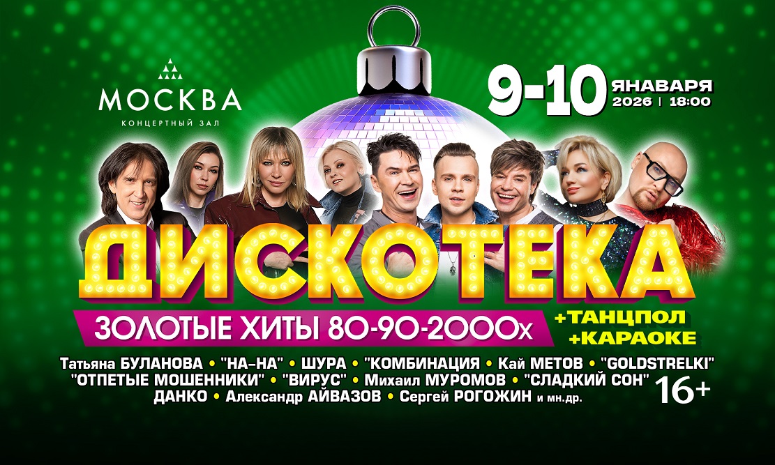 9-10 января 2026 в концертном зале «МОСКВА» в 18-00 москвичей и гостей столицы ожидает невероятное ностальгическое музыкальное танцевальное песенное шоу «Дискотека. Золотые хиты 80-90-2000-х», в котором примут участие звёзды разных поколений. Зрители услышат только проверенные временем хиты, под которые невозможно устоять на месте! Кстати, для желающих – будет возможность танцевать прямо у сцены, на танцполе! Также в концерте будет КАРАОКЕ – все смогут подпевать любимые хиты!