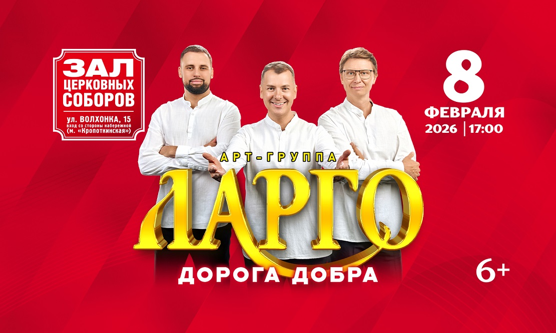 8 февраля 2026 в 17-00 в воскресный вечер со светлым настроением арт-группа «ЛАРГО» представит новую программу «Дорога добра» в одном из красивейший залов столицы – Зале Церковных Соборов Храма Христа Спасителя. Концерт состоится в рамках музыкального проекта «Имена на все времена».
