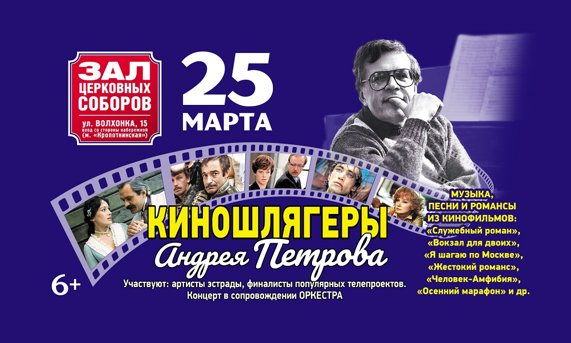 25 марта в Зале Церковных Соборов в рамках проекта «Имена на все времена» состоится концерт «КИНОШЛЯГЕРЫ АНДРЕЯ ПЕТРОВА», посвященный 95-летию со дня рождения выдающегося композитора, народного артиста СССР – Андрея Петрова.О величине композиторского таланта Андрея Петрова говорят сами за себя названия кинофильмов, где звучит его музыка, названия песен и романсов, написанные им. Музыка Андрея Петрова звучит в кинофильмах: «Служебный роман», «Осенний марафон», «Гараж», «Вокзал для двоих», «Жестокий романс», «Берегись автомобиля», «Человек амфибия», «О бедном гусаре замолвите слово», «Я шагаю по Москве», «Попутного ветра «Синяя птица», «Белый Бим черное ухо», «Петербургские тайны», «Старые клячи», «Забытая мелодия для флейты» и во многих других. Многие из этих прекрасных мелодий прозвучат и в концерте в Зале Церковных Соборов в исполнении оркестра.