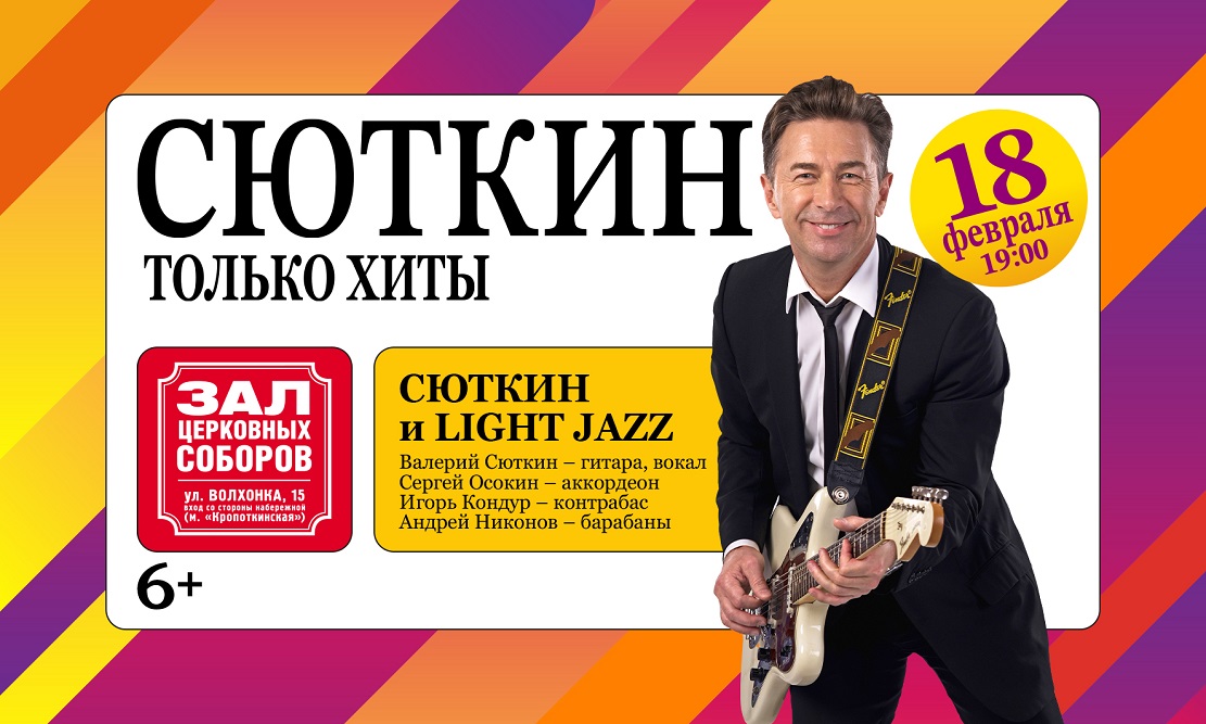 «Стиляга из Москвы», заслуженный артист России Валерий Сюткин исполнит свои знаменитые хиты – «Король оранжевое лето», «Я то, что надо!», «Семь тысяч над землей», «Любите девушки», «Московский бит», «Оранжевый галстук», «Вася», «Москва-Нева», а также изысканные произведения из советских кинофильмов и все, что звучало в радиоприемниках и на танцевальных площадках страны в далекие стиляжные 60-е…