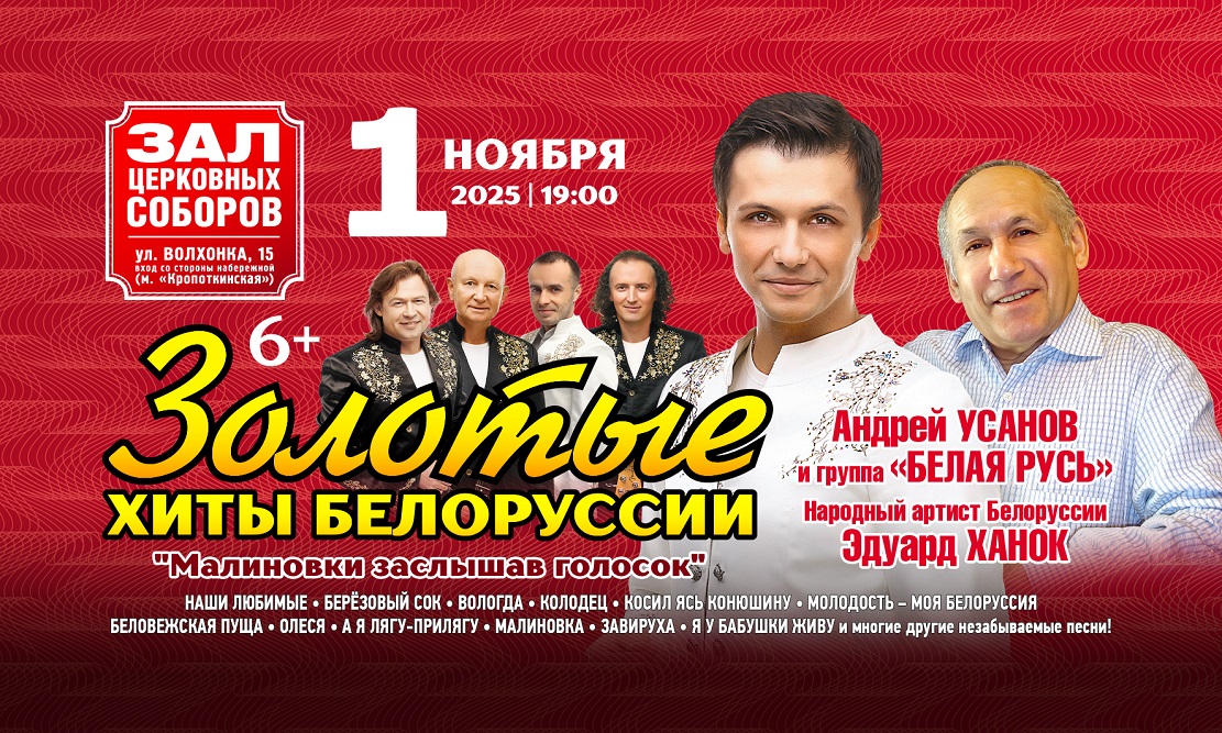 Праздничную концертную программу золотых хитов Белоруссии зрителям подарит Андрей УСАНОВ и группа «Белая Русь» при участии легендарного композитора, народного артиста Белоруссии – Эдуарда ХАНКА.